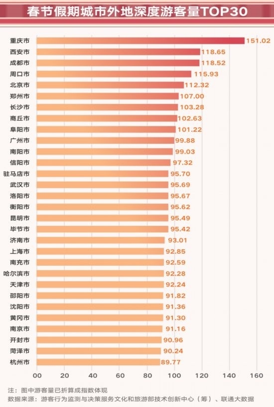 熱點城市假期依舊火爆。熱點城市在春節(jié)假期依舊是旅游市場的贏家,重慶、西安、成都、北京、鄭州位列外地深度游前5位,長沙、廣州、武漢、濟南、上海進入了外地深度游前20位。