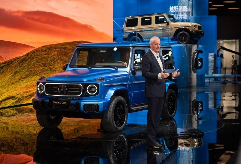 4月25日,在北京中國(guó)國(guó)際展覽中心順義館舉行的2024北京車展上,梅賽德斯—奔馳集團(tuán)股份公司董事會(huì)成員唐仕凱介紹梅賽德斯—奔馳純電G級(jí)越野車。新華社記者 才揚(yáng) 攝