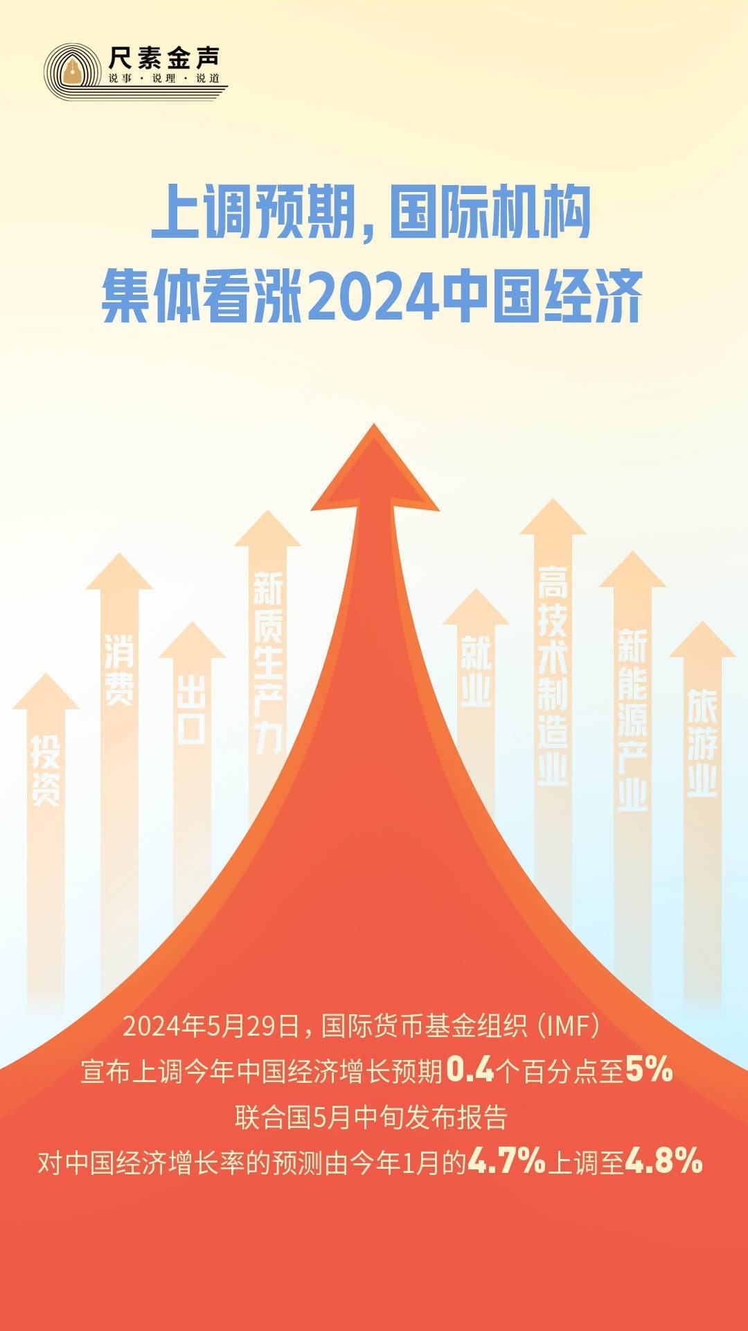 5月29日,國(guó)際貨幣基金組織(IMF)宣布上調(diào)今年中國(guó)經(jīng)濟(jì)增長(zhǎng)預(yù)期0.4個(gè)百分點(diǎn)至5%。聯(lián)合國(guó)5月中旬發(fā)布報(bào)告,對(duì)中國(guó)經(jīng)濟(jì)增長(zhǎng)率的預(yù)測(cè)由今年1月的4.7%上調(diào)至4.8%。4月以來(lái),亞洲開(kāi)發(fā)銀行、摩根士丹利、高盛、瑞銀等國(guó)際金融機(jī)構(gòu)紛紛上調(diào)對(duì)中國(guó)經(jīng)濟(jì)增速的全年預(yù)期。