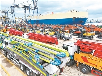 10月14日,國產(chǎn)工程機(jī)械在山東港口煙臺(tái)港集結(jié)等待裝船出口。唐 克攝(人民視覺)