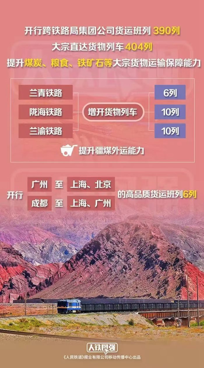 貨運(yùn)方面,鐵路部門統(tǒng)籌運(yùn)用線路、場站資源,安排開行跨鐵路局集團(tuán)公司貨運(yùn)班列390列,大宗直達(dá)貨物列車404列,提升煤炭、糧食、鐵礦石等大宗貨物運(yùn)輸保障能力,為冬季能源保供和國民經(jīng)濟(jì)平穩(wěn)運(yùn)行提供有力支撐。其中,優(yōu)化調(diào)整蘭州鐵路樞紐列車運(yùn)行方案,蘭青、隴海、蘭渝鐵路分別增開貨物列車6列、10列、10列,提升疆煤外運(yùn)能力。適應(yīng)貨運(yùn)市場需求,優(yōu)化貨運(yùn)班列產(chǎn)品供給,開行廣州至上海、北京,成都至上海、廣州的高品質(zhì)貨運(yùn)班列6列,串聯(lián)京津冀、長三角、粵港澳大灣區(qū)、成渝地區(qū)等主要經(jīng)濟(jì)區(qū)域,打造快捷物流產(chǎn)品示范線。