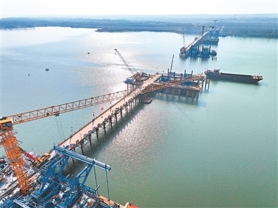 江西省南昌市南昌縣昌南大橋項目施工現(xiàn)場,工人在加緊推進橋梁承臺和引橋建設。