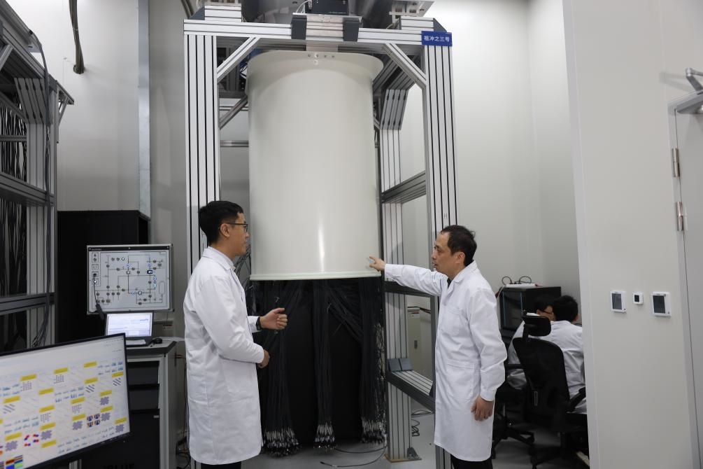 3月3日,中國科學(xué)技術(shù)大學(xué)教授、“祖沖之號”量子計算總師朱曉波(右)與學(xué)生討論制冷機狀態(tài)。新華社發(fā)(代蕊攝)