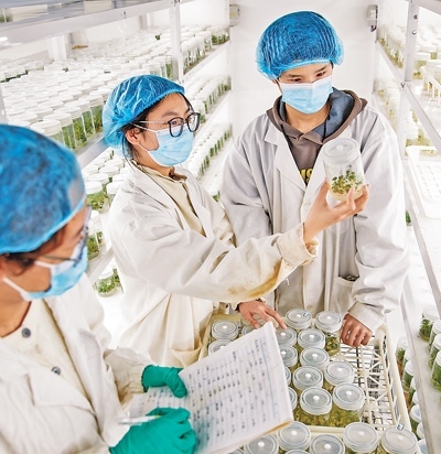 河南商丘睢縣城關(guān)鎮(zhèn)袁莊村,工作人員在實(shí)驗(yàn)室內(nèi)查看草莓組培苗生長情況。