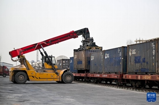 4月3日,在呼和浩特市新暢鐵路專用線,鐵海聯(lián)運“一單制”運輸專列開行。
