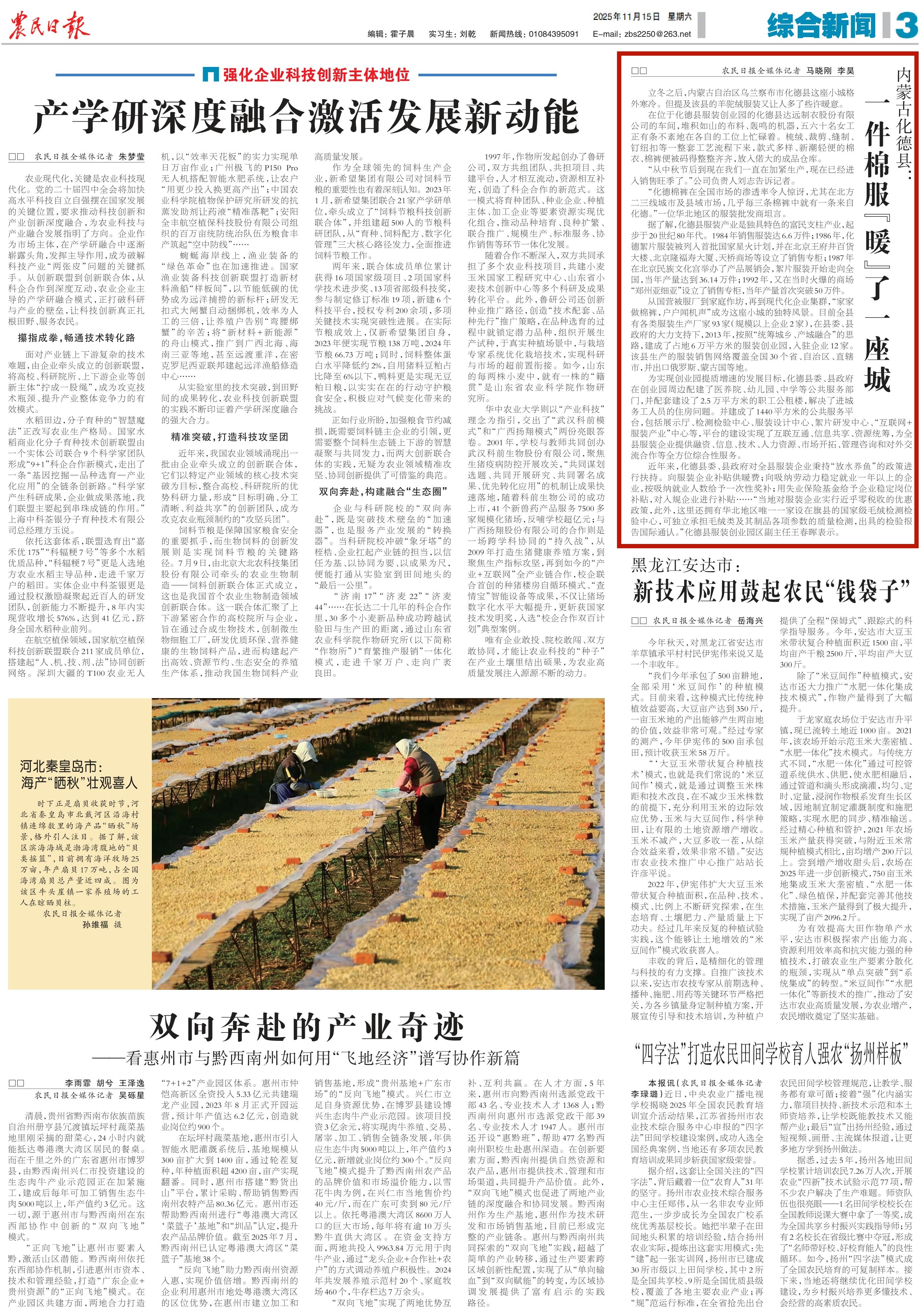 2025年11月15日,《農(nóng)民日報》第3版刊發(fā)題為《內(nèi)蒙古化德縣:一件棉服“暖”了一座城》的文章,報道了內(nèi)蒙古化德縣從國營被服廠到家庭作坊,再到現(xiàn)代化企業(yè)集群,生產(chǎn)的服裝銷售網(wǎng)絡(luò)覆蓋全國30個省、自治區(qū)、直轄市,并出口俄羅斯、蒙古國等地。
