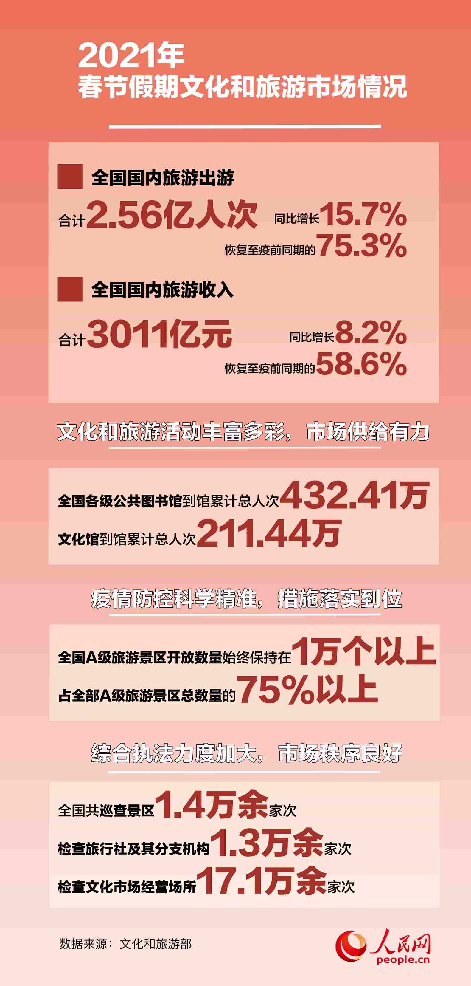 人民網(wǎng)北京2月25日電 (白帆)2月25日,文化和旅游部發(fā)布了2021年春節(jié)假期文化和旅游市場(chǎng)情況。數(shù)據(jù)顯示,綜合各地文化和旅游部門(mén)、通訊運(yùn)營(yíng)商、線上旅行服務(wù)商的數(shù)據(jù),經(jīng)文化和旅游部數(shù)據(jù)中心測(cè)算,春節(jié)假期七天,全國(guó)國(guó)內(nèi)旅游出游合計(jì)2.56億人次,同比增長(zhǎng)15.7%,恢復(fù)至疫前同期的75.3%。實(shí)現(xiàn)國(guó)內(nèi)旅游收入3011億元,同比增長(zhǎng)8.2%,恢復(fù)至疫前同期的58.6%。