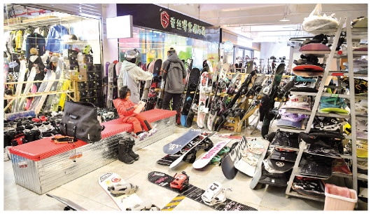 2月14日,在陜西太白縣鰲山滑雪場內,俱樂部會員在挑選滑雪裝備。新華社記者 邵瑞 攝