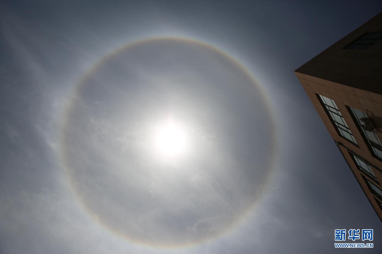 5月25日午后,內(nèi)蒙古自治區(qū)呼和浩特市上空出現(xiàn)日暈,巨大的暈環(huán)圍繞在太陽四周,十分壯觀。新華網(wǎng) 楊騰格爾 攝