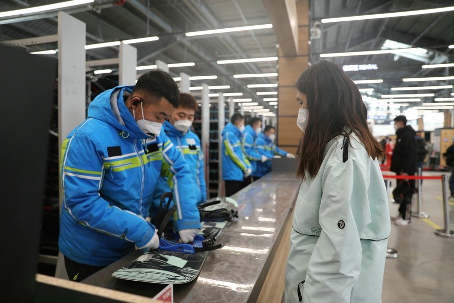 滑雪愛好者正在領取雪具