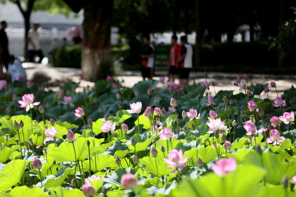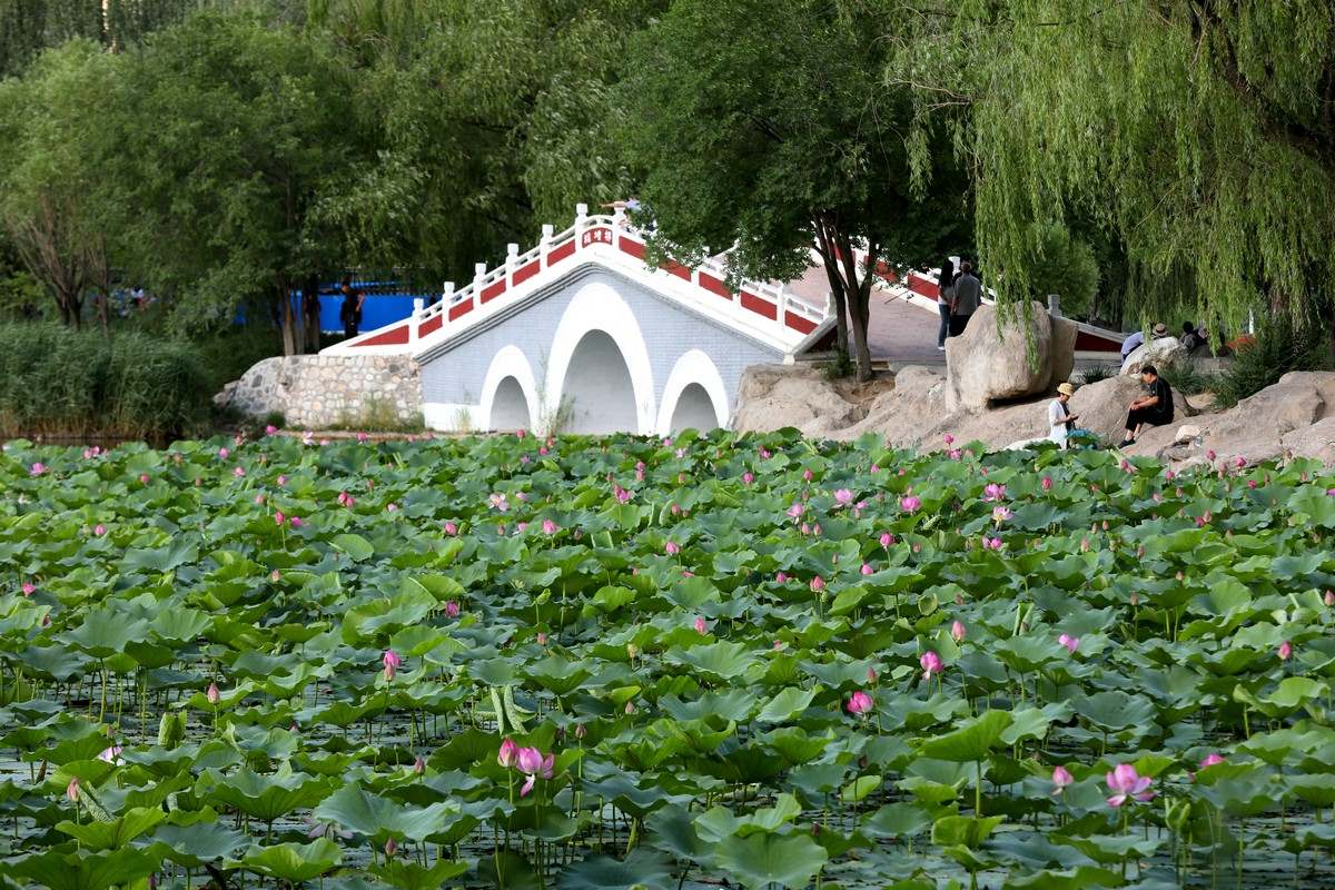 7月8日,呼和浩特青城公園的荷花盛開,游客紛紛打開拍照。
