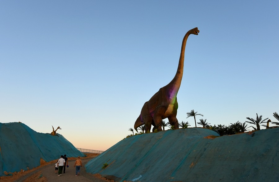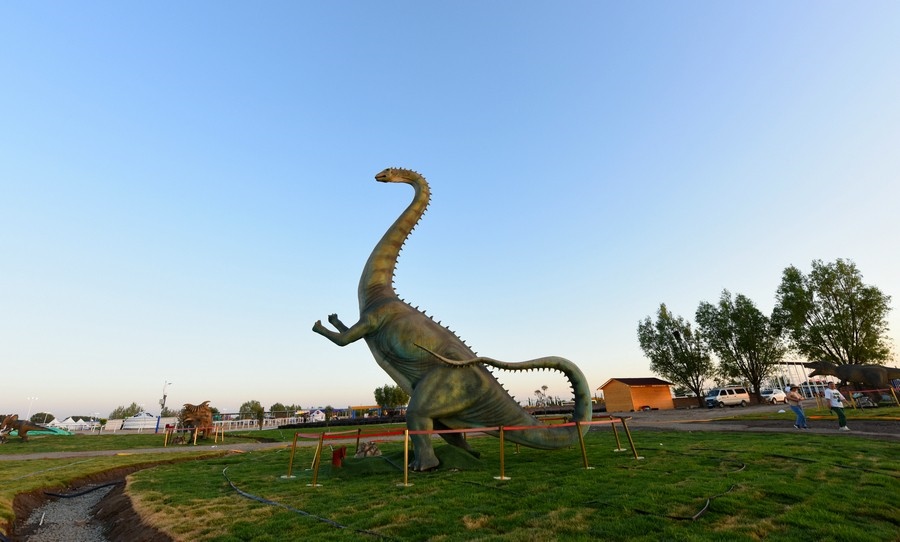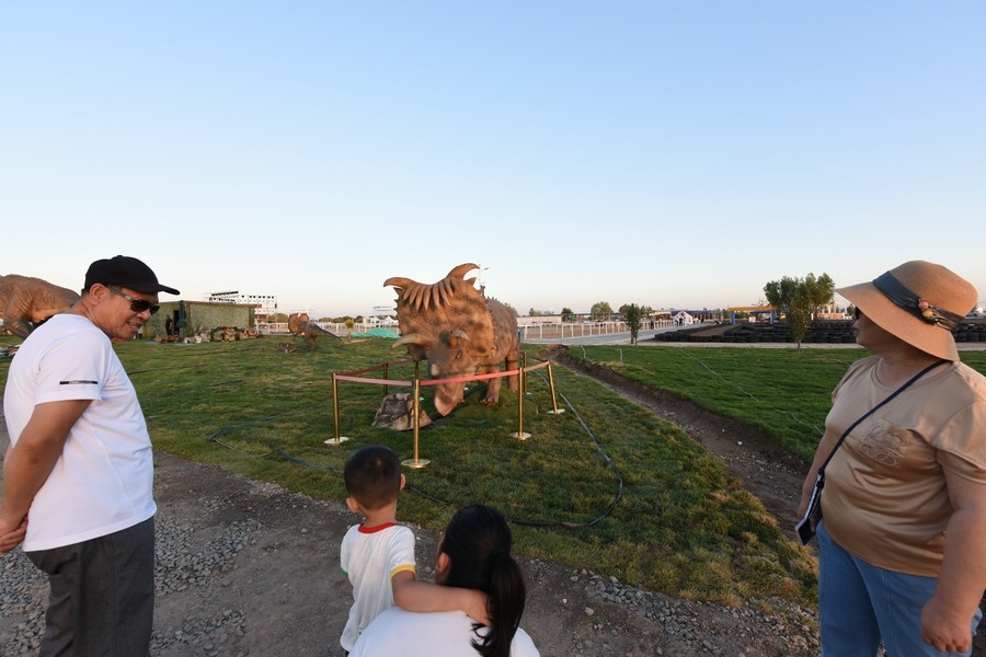 游客從高25米的亞洲最大的三條恐龍之一腳下經(jīng)過(guò) 記者 張楊攝影