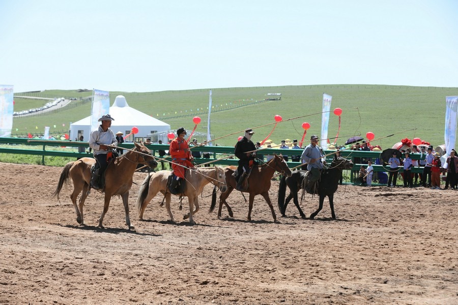 文藝演出結(jié)束后,進(jìn)行了傳統(tǒng)的那達(dá)慕賽事項(xiàng)目。賽馬場(chǎng)上群馬奔騰、塵土飛揚(yáng),場(chǎng)面蔚為壯觀,騎手們揚(yáng)鞭策馬,展現(xiàn)出精湛的騎術(shù),贏得觀眾陣陣歡呼。摔跤場(chǎng)上,搏克手你來(lái)我往互不相讓,斗智斗勇……