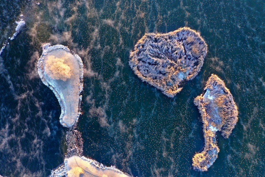 12月15日,上萬只赤麻鴨在塞外“千島湖”棲息游弋