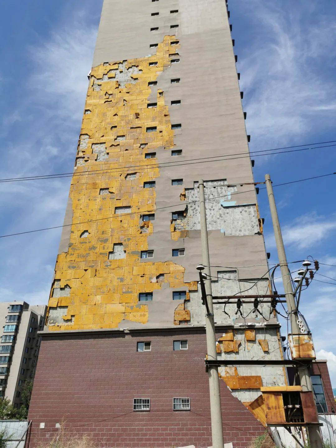 7月1日10時(shí)許,記者來到聞都雅苑4號(hào)樓下,抬頭望去,該棟樓西側(cè)墻壁有三處地方出現(xiàn)破損,大片的墻皮和里面的保溫層均已脫落。記者注意到,聞都雅苑共有4棟高層,該小區(qū)只有東西和南北兩條主干道以及西側(cè)一條小走廊,而4號(hào)樓正好位于南北主干道一側(cè)。據(jù)小區(qū)居民郝先生介紹,不斷掉落的保溫層已經(jīng)威脅到了居民的人身安全。今年5月6日,呼和浩特市出現(xiàn)大風(fēng)天氣,在風(fēng)力的作用下,4號(hào)樓東西兩側(cè)的外墻保溫層出現(xiàn)大面積脫落,一位恰巧路過4號(hào)樓西側(cè)的女性業(yè)主不幸被掉落的材料砸中,導(dǎo)致腿部受傷,此事也給小區(qū)居民帶來了恐慌。