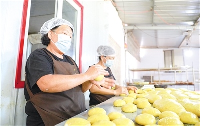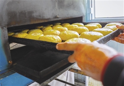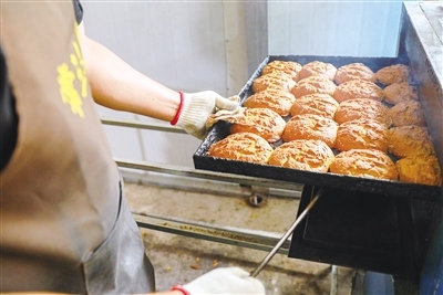 “我們堅(jiān)持手工制作,就是想留住這個(gè)味道!”常三文是隆盛莊月餅制作技藝非遺傳承人,他帶記者來到了打月餅的作坊。一個(gè)約60平方米的房間里有兩個(gè)大鐵鍋,一個(gè)鐵鍋里熬著糖水,另一個(gè)鐵鍋用來和面。一名男工將面粉、熟胡麻油、糖水等按比例倒入鐵鍋,然后用鐵鏟攪拌起來。鐵鍋旁邊是一個(gè)做月餅的大案板,4個(gè)女工稱重、分劑、做胚、擺放,各自忙活著。常三文的兒子常曉峰負(fù)責(zé)將擺放好的月餅放進(jìn)燒爐火的烤爐,計(jì)時(shí)、下簽子、刷油……直至月餅烤制完成出爐。