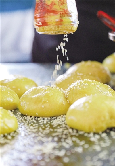 說起常家與隆盛莊月餅干貨制作技藝的結(jié)緣,常三文說,他的祖爺爺常錫林從山西帶著14歲的兒子常清(常三文的爺爺)來到隆盛莊,并將常清送到“上三元”學(xué)徒,學(xué)得“上三元”制作各色糕點(diǎn)的絕活,這其中也包括“豐鎮(zhèn)月餅”的做法。這門手藝在常三文家族內(nèi)一代代傳承至今,常三文已經(jīng)是第四代。如今,常曉峰也加入到隆盛莊月餅干貨制作技藝的傳承中,成為第五代。“制作技藝重要,原料也很重要?!背H母嬖V記者,要堅(jiān)持手工傳統(tǒng)技藝制作,月餅的面粉、胡麻油都必須有保障,才能讓做出來的月餅不“變味”。