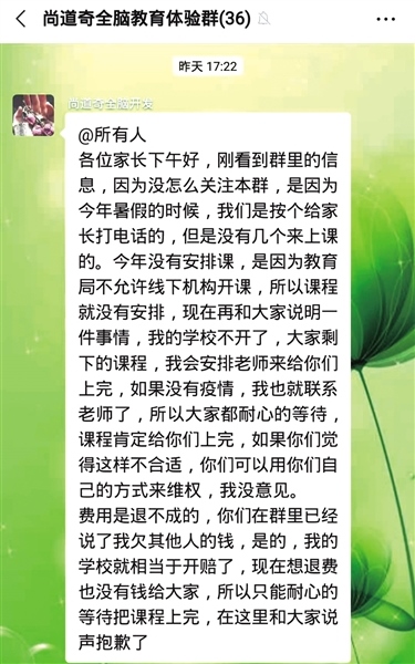 根據(jù)謝女士提供的轉(zhuǎn)賬證明和聊天截圖記者注意到,“尚道奇全腦教育體驗群”1月15日發(fā)布的一則通知稱,今年暑假,機構(gòu)老師曾挨個給家長打電話通知上課,但是沒有幾個來上課的,加上教育局不允許線下機構(gòu)開課,所以課程遲遲沒有安排。并稱學(xué)校賠錢了,沒有錢退給大家,只能耐心等待疫情結(jié)束后安排上課,如果家長覺得不合適,可以用自己的方式維權(quán)?!八恼f辭明顯前后矛盾,暑假期間說課件損毀,現(xiàn)在又說沒學(xué)生上課。”謝女士氣憤地說,和她遭遇同樣情況的還有30多名家長,399元雖然不是大數(shù)目,但這樣欺騙大家實屬不該。