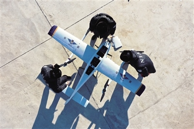 測量、加油、調試、升空……隨著螺旋槳高速轉動,一架 “鷹眼”固定翼無人機騰空而起,劃破北疆寂靜的天空,以每小時110公里的速度沿著邊管區(qū)巡航。
