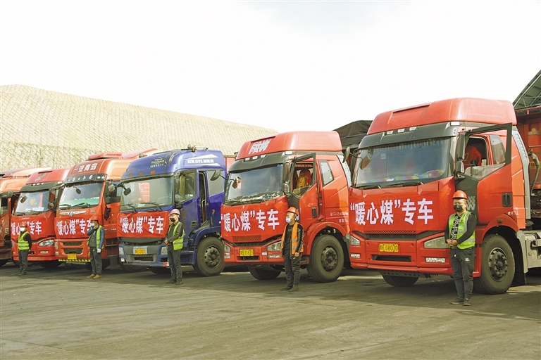 10月24日,一輛輛掛著大紅綢、載著“暖心煤”的運(yùn)煤大卡車排成一列,從鄂爾多斯達(dá)拉特旗杭蓋溝煤礦整裝待發(fā),即將發(fā)往位于吉格斯太鎮(zhèn)的榮通煤炭物流園區(qū),那里是該鎮(zhèn)“暖心煤”的發(fā)放點(diǎn)。