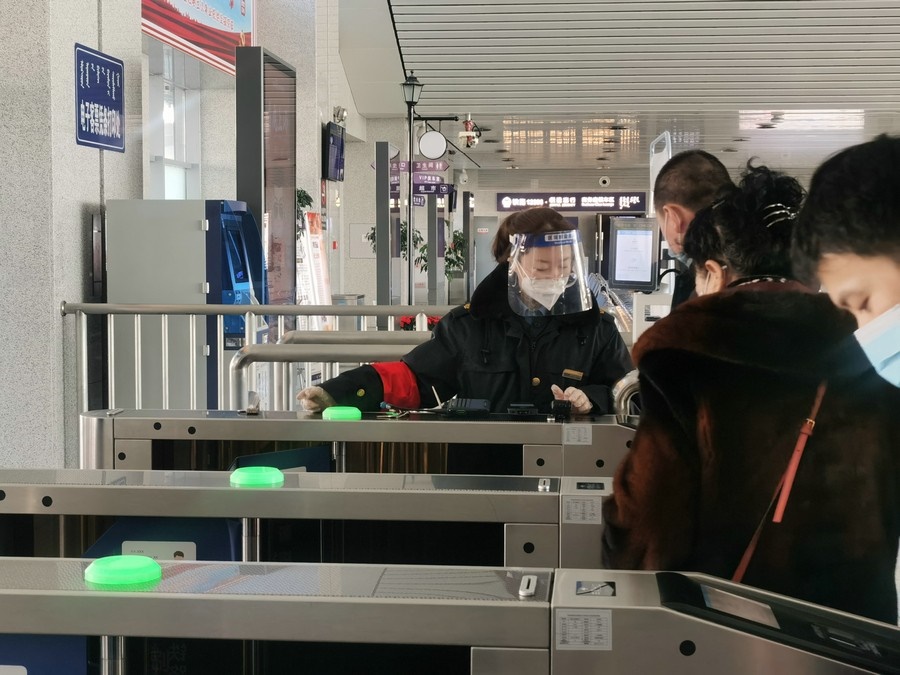 1月17日,春運首日,集寧站烏蘭察布站客運人員組織旅客通過閘機有序檢票進站。