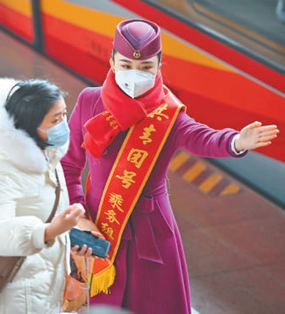 春運首日,成渝高鐵“復興號”智能動車組“共青團號”列車首發(fā),這是全國首次在“復興號”智能動車組中常態(tài)化開行“共青團號”列車,列車將開展常態(tài)化志愿服務。圖為志愿者服務旅客乘車。