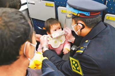 南昌客運段“井岡山號”列車乘務人員積極開展“暖心春運”行動,通過貼喜慶窗花、贈小旅客愛心手環(huán)和卡通口罩等一系列溫馨舉措,把溫暖送到旅客身邊。圖為乘務人員為小旅客贈送愛心口罩。