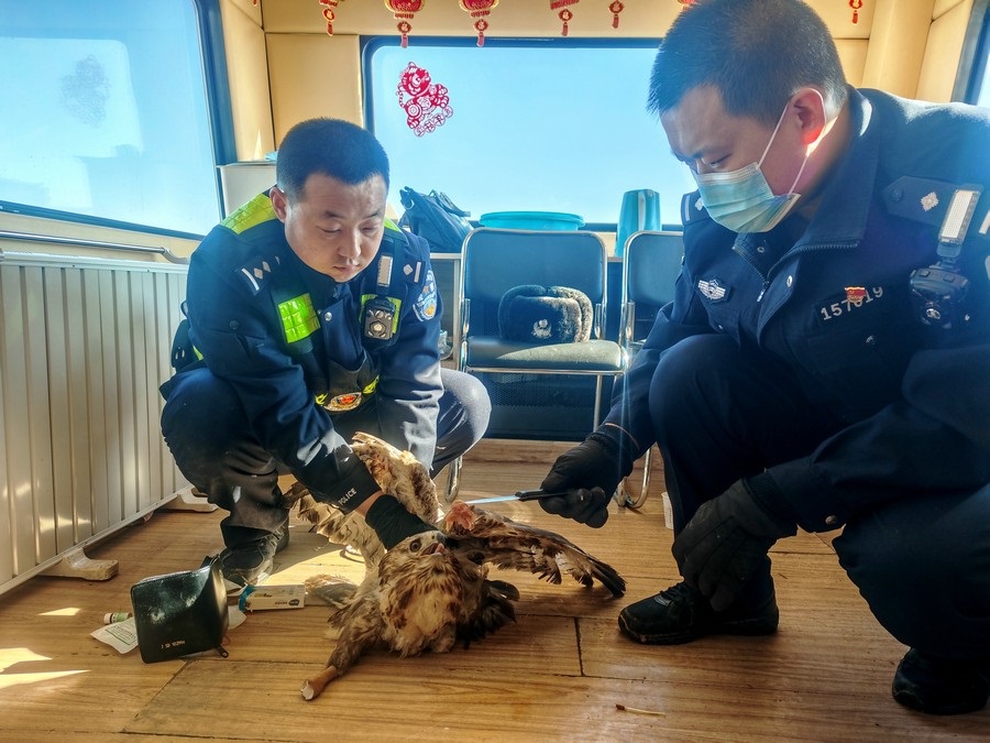 北疆新聞網(wǎng)、北疆新聞APP、北疆云消息(記者 劉嬙 通訊員 張路 張冬)2月10日,內(nèi)蒙古烏蘭察布市四子王旗腦木更邊境派出所民警在執(zhí)勤巡邏途中,發(fā)現(xiàn)一只“大鳥”被困在網(wǎng)圍欄上。民警靠近后仔細(xì)觀察發(fā)現(xiàn),這只“大鳥”在奮力撲打翅膀但無法飛行,右爪缺失,受傷嚴(yán)重。民警通過手機(jī)搜索網(wǎng)絡(luò)圖片比對,初步判定為國家二級保護(hù)動物鷹隼。