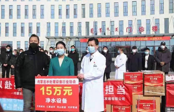 2月25日,由內(nèi)蒙古自治區(qū)工商聯(lián)組織,內(nèi)蒙古水處理設(shè)備行業(yè)協(xié)會聯(lián)合山東省凈水專委會,向內(nèi)蒙古第三醫(yī)院捐贈價值15萬凈水設(shè)備和100件蘇打水。當(dāng)天,內(nèi)蒙古自治區(qū)黨委統(tǒng)戰(zhàn)部副部長、自治區(qū)工商聯(lián)黨組書記梁淑琴,內(nèi)蒙古自治區(qū)工商聯(lián)黨組成員白春艷,一級巡視員屈晨然、二級巡視員呂萬海、武軍等出席捐贈活動。