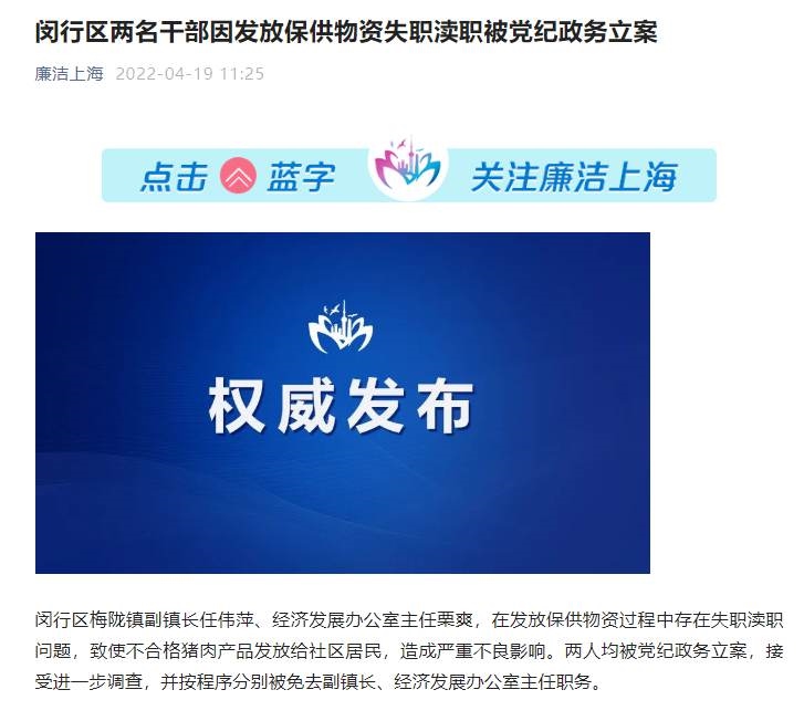 閔行區(qū)梅隴鎮(zhèn)副鎮(zhèn)長任偉萍、經(jīng)濟(jì)發(fā)展辦公室主任栗爽,在發(fā)放保供物資過程中存在失職瀆職問題,致使不合格豬肉產(chǎn)品發(fā)放給社區(qū)居民,造成嚴(yán)重不良影響。兩人均被黨紀(jì)政務(wù)立案,接受進(jìn)一步調(diào)查,并按程序分別被免去副鎮(zhèn)長、經(jīng)濟(jì)發(fā)展辦公室主任職務(wù)。