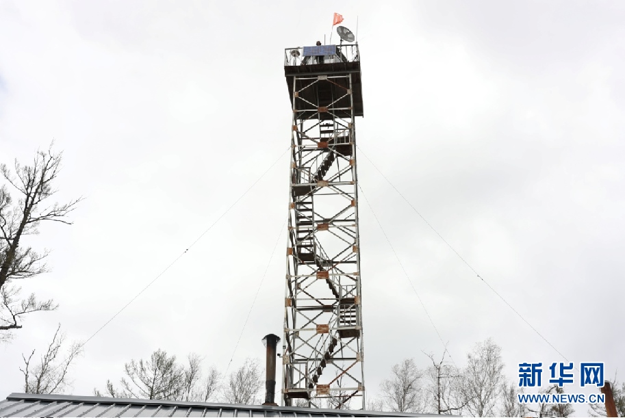 5月11日,57歲的森防瞭望員周桂波站在22米高的瞭望塔上,穿著棉襖棉褲頂著寒風(fēng)瞭望、匯報(bào)、記錄。新華網(wǎng)發(fā)(欒維敬 攝)