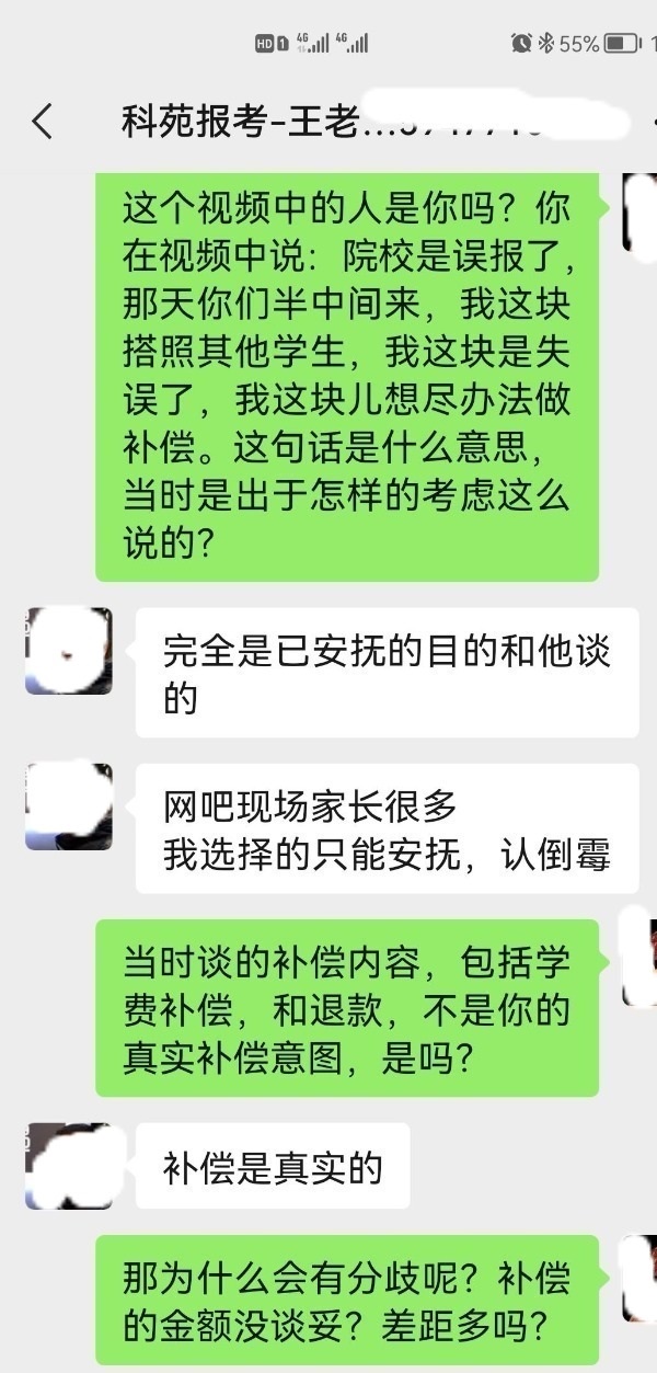 據(jù)樊女士介紹,負責給小安報志愿的是科苑報考的王金寶老師,也是內(nèi)蒙古科苑信息科技有限公司的股東之一。樊女士提供的視頻顯示,這名老師在網(wǎng)報志愿現(xiàn)場回復樊女士:“院校就是誤報了,因為那天你們是半中間來,還有其他學生,搭照學生,我這塊兒就失誤了,我這塊兒想盡辦法做補償?!比欢糠从?,那天以后,這名老師開始反口,不承認誤報,也不愿意按照當天商定的補償方案執(zhí)行。