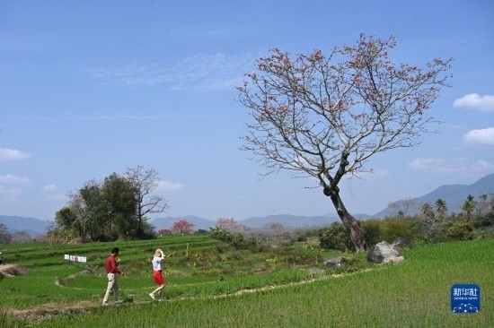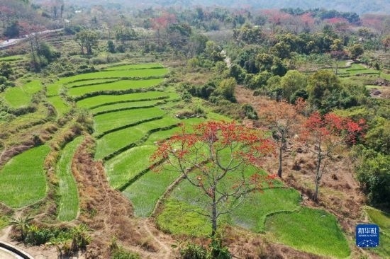 這是在海南昌江拍攝的梯田與木棉花(2月17日攝,無人機(jī)照片)。