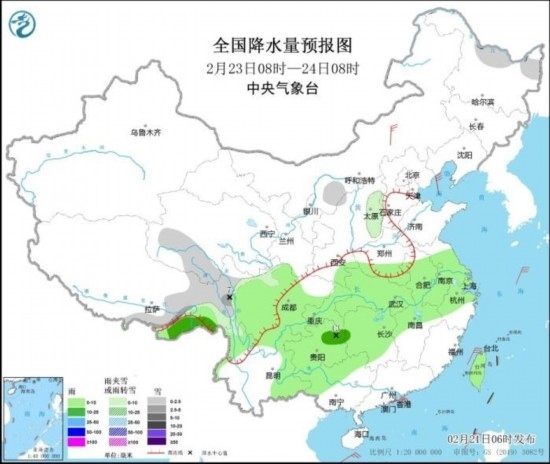 全國降水量預報圖(2月23日08時-24日08時)。圖片來源:中央氣象臺網(wǎng)站