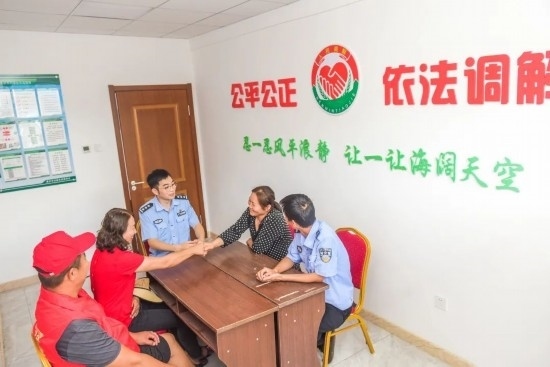 圖為移民管理警察王鐵映為轄區(qū)群眾化解糾紛。