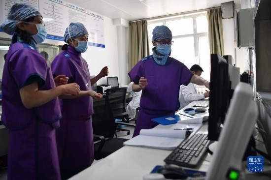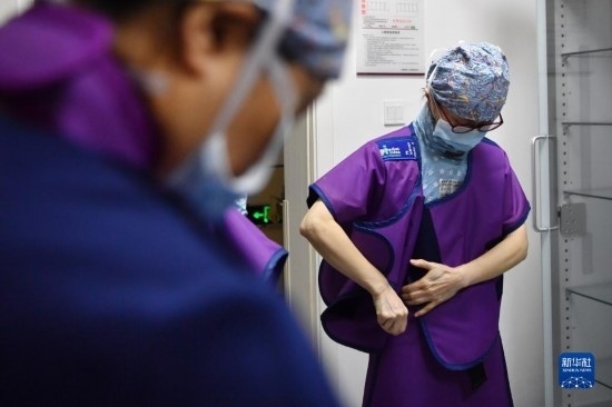 3月6日,馬娜(右)和同事穿上鉛衣準備手術(shù)。