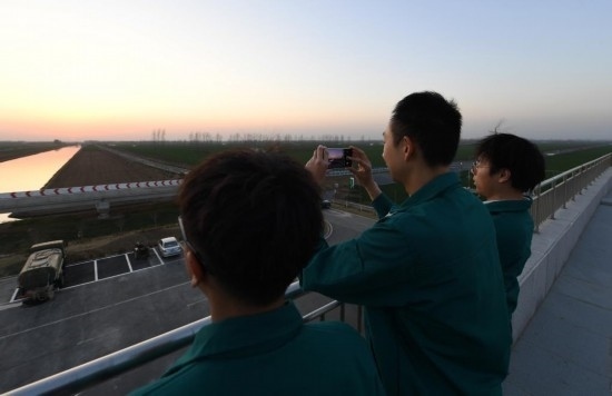 3月14日,在西平縣老王坡高標(biāo)準(zhǔn)服務(wù)中心的二樓平臺(tái),臺(tái)曉林(右)、王英凡和王仲琦(左)下班后在看夕陽。