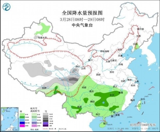 3月28日08時至29日08時,西藏北部和東部、青海東部、川西高原中北部等地部分地區(qū)有小雪或雨夾雪,其中,西藏東北部、川西高原北部等地部分地區(qū)有中到大雪。西藏東南部、江南大部、西南地區(qū)大部、華南等地部分地區(qū)有小到中雨,局地有大雨(見圖2)。