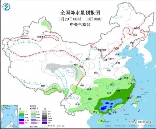 圖3 全國降水量預報圖(3月29日08時-30日08時)