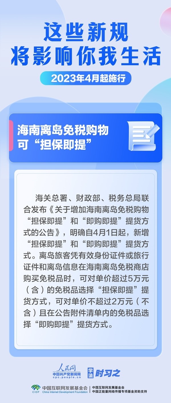 為在法治軌道上推進(jìn)黃河流域生態(tài)保護(hù)和高質(zhì)量發(fā)展提供有力保障,海南離島免稅購物可“擔(dān)保即提”“即購即提”,啟用第七版出生醫(yī)學(xué)證明……4月,這些新規(guī)施行,將影響你我生活。
