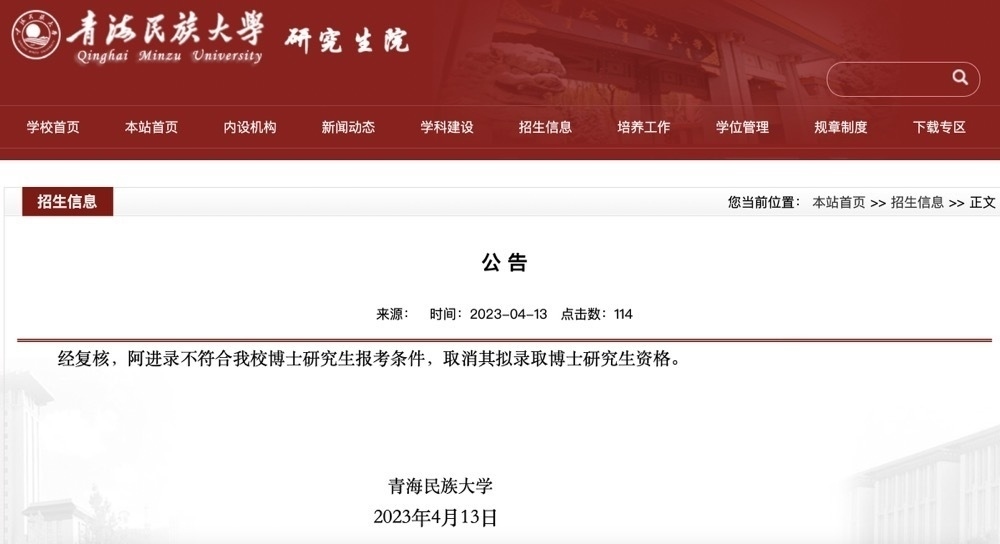 ·青海民族大學(xué)回應(yīng)黨委副書(shū)記擬錄取為本校博士:取消資格。