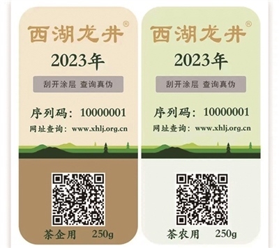 “專用標(biāo)識(shí)分為‘證明標(biāo)N(茶農(nóng)用)’和‘證明標(biāo)Q(企業(yè)用)’兩種樣式,相當(dāng)于西湖龍井茶的一張‘身份證’,上面包含了使用主體、年份、規(guī)格、編號(hào)、防偽信息等內(nèi)容?!本皡^(qū)執(zhí)法隊(duì)提醒,龍井茶大量上市時(shí)期,購買正宗西湖龍井需認(rèn)準(zhǔn)專用標(biāo)識(shí)。