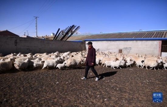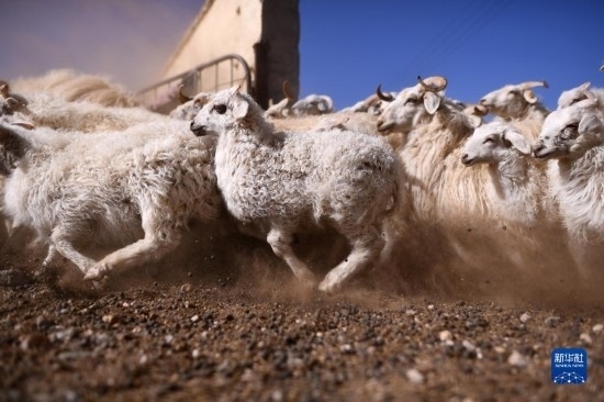 4月14日,在青海省海北藏族自治州剛察縣泉吉鄉(xiāng)寧夏村,牧民拉寶家的羊群離開(kāi)羊圈前往草場(chǎng)。