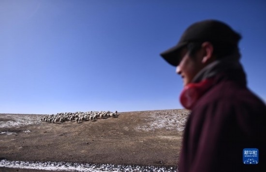 4月14日,在青海省海北藏族自治州剛察縣泉吉鄉(xiāng)寧夏村,牧民拉寶將羊群趕往草場(chǎng)。