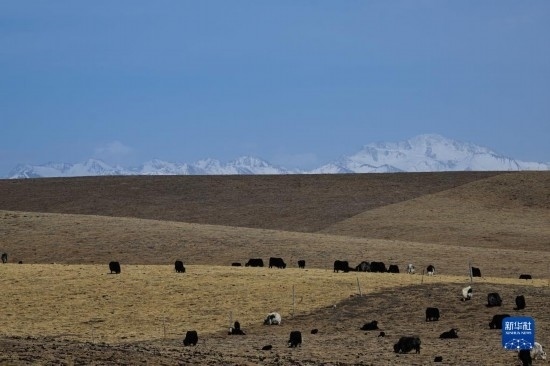 4月17日,在青海省海北藏族自治州門源回族自治縣皇城蒙古族鄉(xiāng),一群牦牛在祁連山腹地的草場(chǎng)上活動(dòng)。