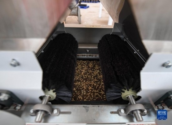 4月20日,在彭山區(qū)公義鎮(zhèn),智能水稻育秧播種流水線將種子播種到育秧盤內(nèi)。