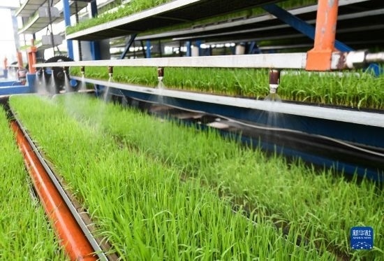 4月20日,在彭山區(qū)公義鎮(zhèn)的數(shù)智水稻示范基地,循環(huán)式智能育秧機(jī)給秧苗補(bǔ)水。