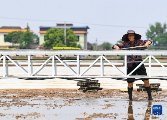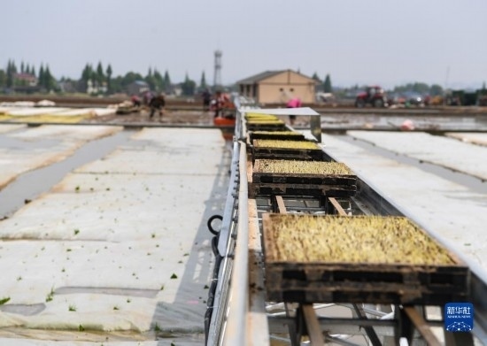 4月20日,在彭山區(qū)公義鎮(zhèn)的數(shù)智水稻示范基地,秧盤智能傳輸帶運(yùn)送育秧盤。