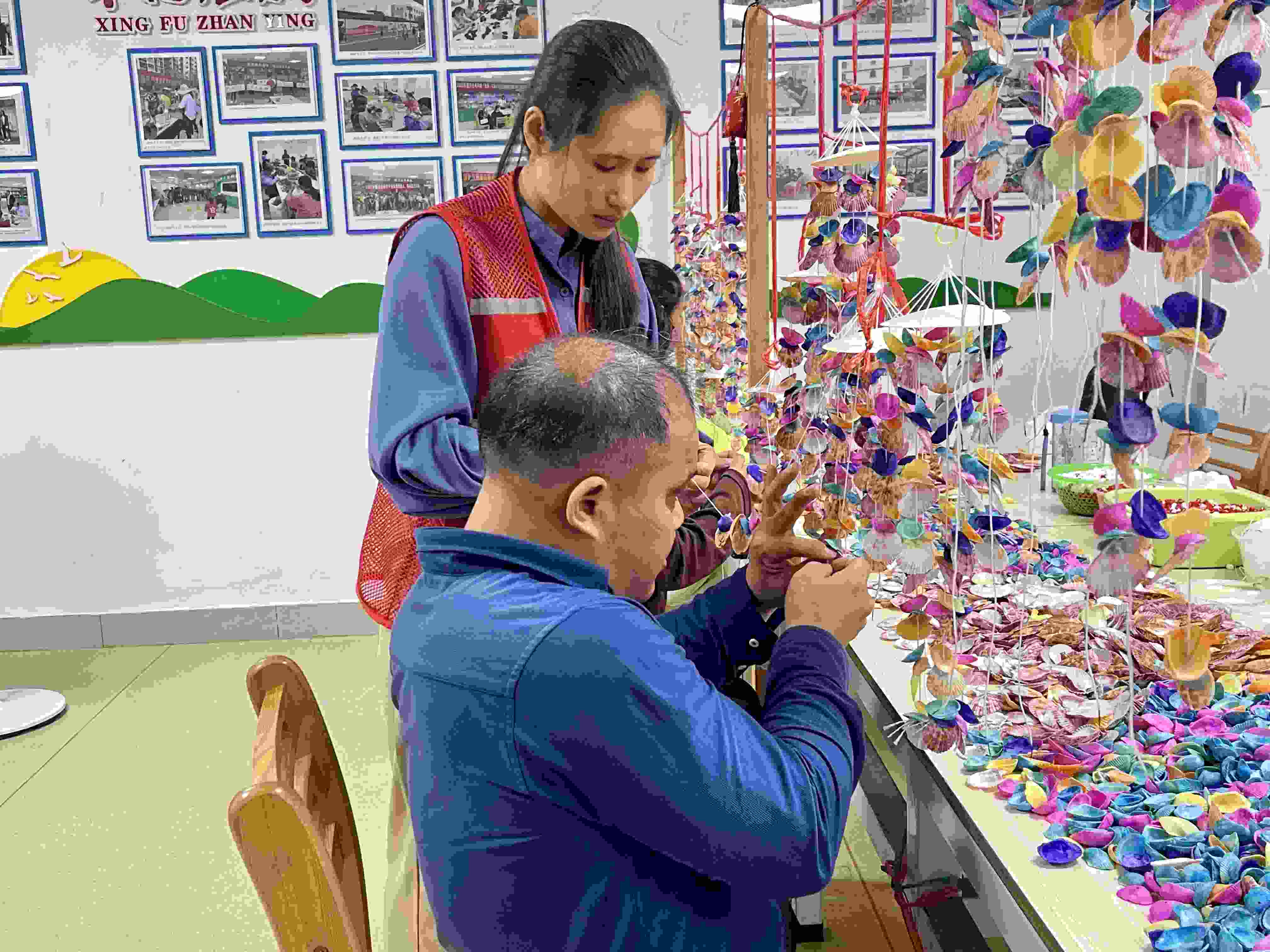 在北海市銀海區(qū)僑港殘疾人輔助性就業(yè)及日間照料中心(以下簡(jiǎn)稱“中心”),工作人員在指導(dǎo)殘疾人串貝殼。這里已經(jīng)安置了11名殘疾人與企業(yè)簽訂勞動(dòng)合同,人均年收入在2萬(wàn)元左右。