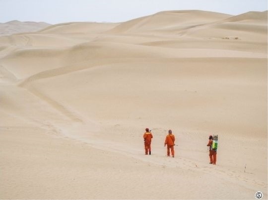 圖⑤東方地球物理公司新疆塔里木物探處的工人馮永生(前)、馮雙生(中)、馮志鵬在沙漠中進(jìn)行測(cè)量定位,標(biāo)記鉆井點(diǎn)。新華社發(fā)